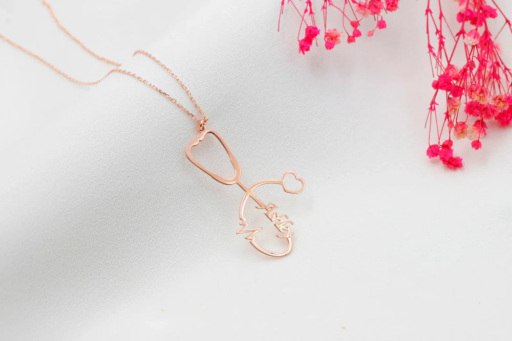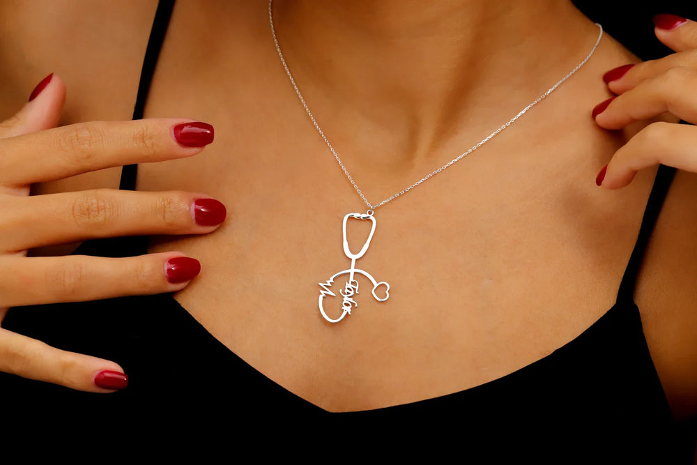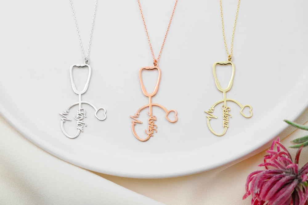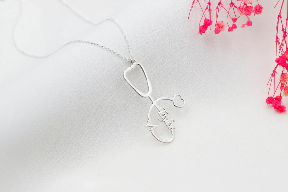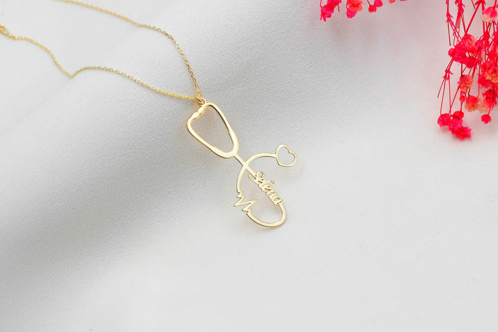 This personalized stethoscope necklace is a thoughtful gift for nurses, doctors, or medical students. The custom pendant features a stethoscope with your chosen name, making it a unique and stylish piece of everyday wear. Show your appreciation for the healthcare professional in your life with this charming necklace.